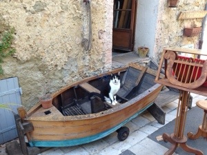 Anyway, with no other option seemingly available, I steeled myself for the usual load of Irish republican claptrap, loaded up my travelling cigar wallet (it being a racing certainty that he would have “forgotten” to go the tabac to buy his own, – he did -) and headed for lunch at Cafe Des Arcades, back in favour now that the hoards of holiday makers have thankfully left the area for the summer, relieving the pressure on their kitchen. On the way I spotted this cat In a boat in a side street in Valbonne. Cab owl be far away? and where is the pea green paint?