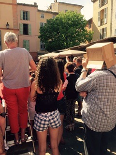 Since we arrived the Friday before last we have had a full and hard week of preparing the house for a terrible onslaught of visitors this summer, but I managed to persuade That Nice Lady Decorator that we should pop down into Valbonne Square for a spot of lunch as it was a Sunday, a day of rest (the Reverend Jeff has at least adopted one sensible religious idea). What I had not expected was that there was a fashion show being staged in the Square, and that some people were determined to make their own fashion statement whilst watching the various models, often in a state of undress, strut their stuff to the, frankly, dribbling masses. At my age, dribbling is about all I can manage (and nowadays I find that quite rewarding), but even I, an often daring pioneer when it comes to sartorial matters, would never resort to making a fashion statement as extreme as that which I captured on my phone during proceedings.