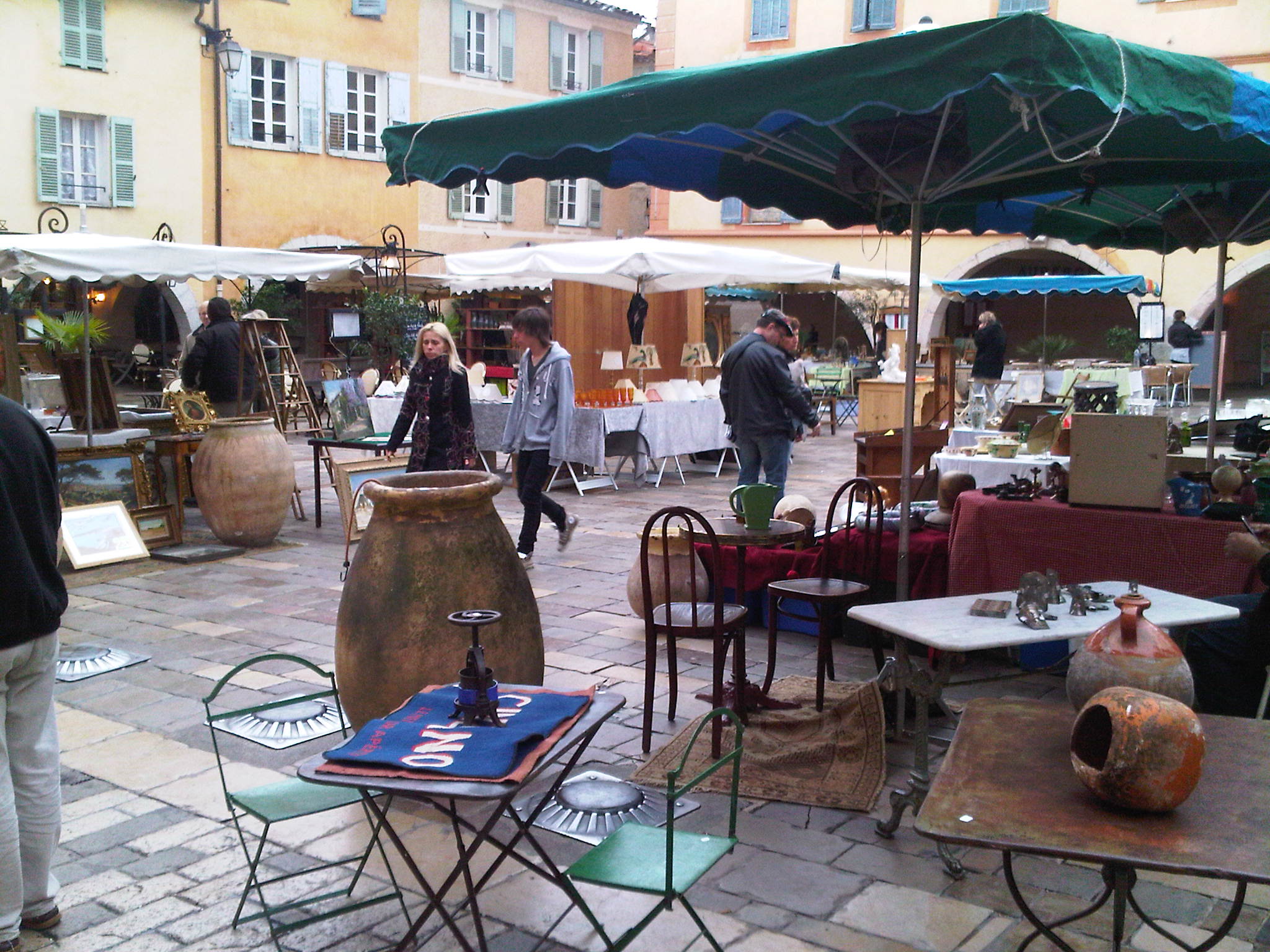 The title of todays blog could be confusing, is golf played by a bunch of antiques in Valbonne? Does the expression ex-pat have any synergy with antiques? This particular antique was due to play golf today at Estoril with the Landlubbers, an offshoot of the Riviera Ex Pats Golf Society www.regsgolf.com , however, I have something of a reputation of detesting playing in the rain, which is forecast today. When living in England, one is forced to play in the rain if one wants to play regularly. This should not be the case down here, although we have had a spectacularly horrible winter, great for the local ski resorts many of which are reporting up to 2 metres of snow this Easter weekend. It is mark of how poor this winter has been and thus how little I have played that I actually considered turning out. The organiser, our leader Dave “the fade” Dowling, called me a wimp, so I puffed myself up, dug out the wet weather gear, found my never before used Currencies Direct umbrella and then thought f*** it, I’ll go into Valbonne, get The Sunday Times have a coffee and look at the antiques market which is held in the square in Valbonne on the first Sunday of each month. My picture shows today’s event before the promised storms, which as I speak look like commencing. Valbonne is known as a prosperous place and it seems to me that the prices at the fair reflect that, but it normally gets a large turnout, many of whom on a nice day have lunch in the village as well. No doubt “The Dowling Fade” will be on the email before dark, lying through his teeth that it was sunny all day and they had a wonderful game. That reminds me of an earlier REGS event some years before I arrived here when a tournament was staged somewhere up in the hills. It was a beautiful spring day, and after the golf, lunch was served along with significant amounts of rose and the trip down the hill did not commence until darkness had descended. One of the competitors, who had apparently imbibed freely, stopped his car to relieve himself, forgot to apply the handbrake and his car rolled into a crevasse 100 metres below. Shocked by this he was taken by another player to the Queens Legs to settle his nerves with a stiff drink. In the meantime the police found his car, went to his house and told his wife the car had been found wrecked but that there was no sign of her husband. Now you might think she would have been happy to see him back several hours later in good health but a little the worse for wear, but astonishingly, she was anything but! I shall never understand women..